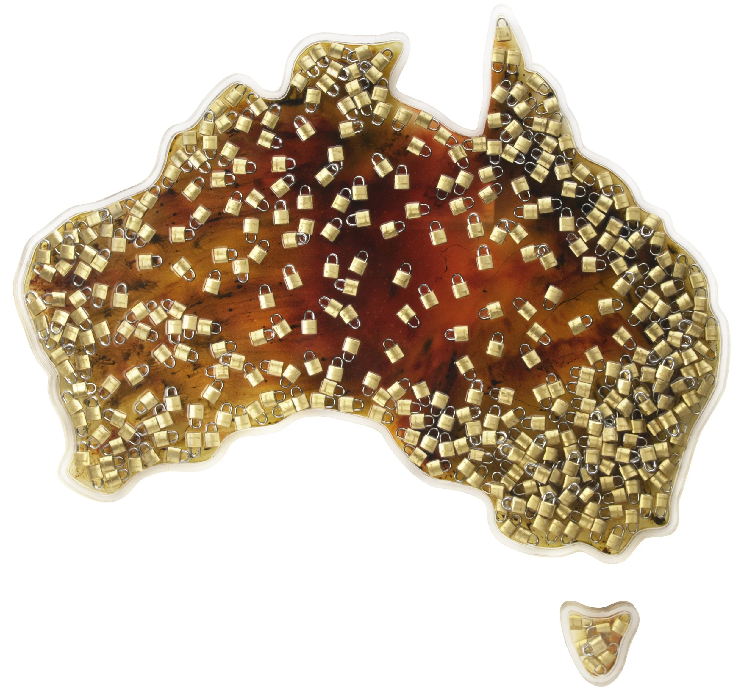 Locked. 2012. Padlocks, lacquer and pigment in resin on perspex. 103 x 95cm.