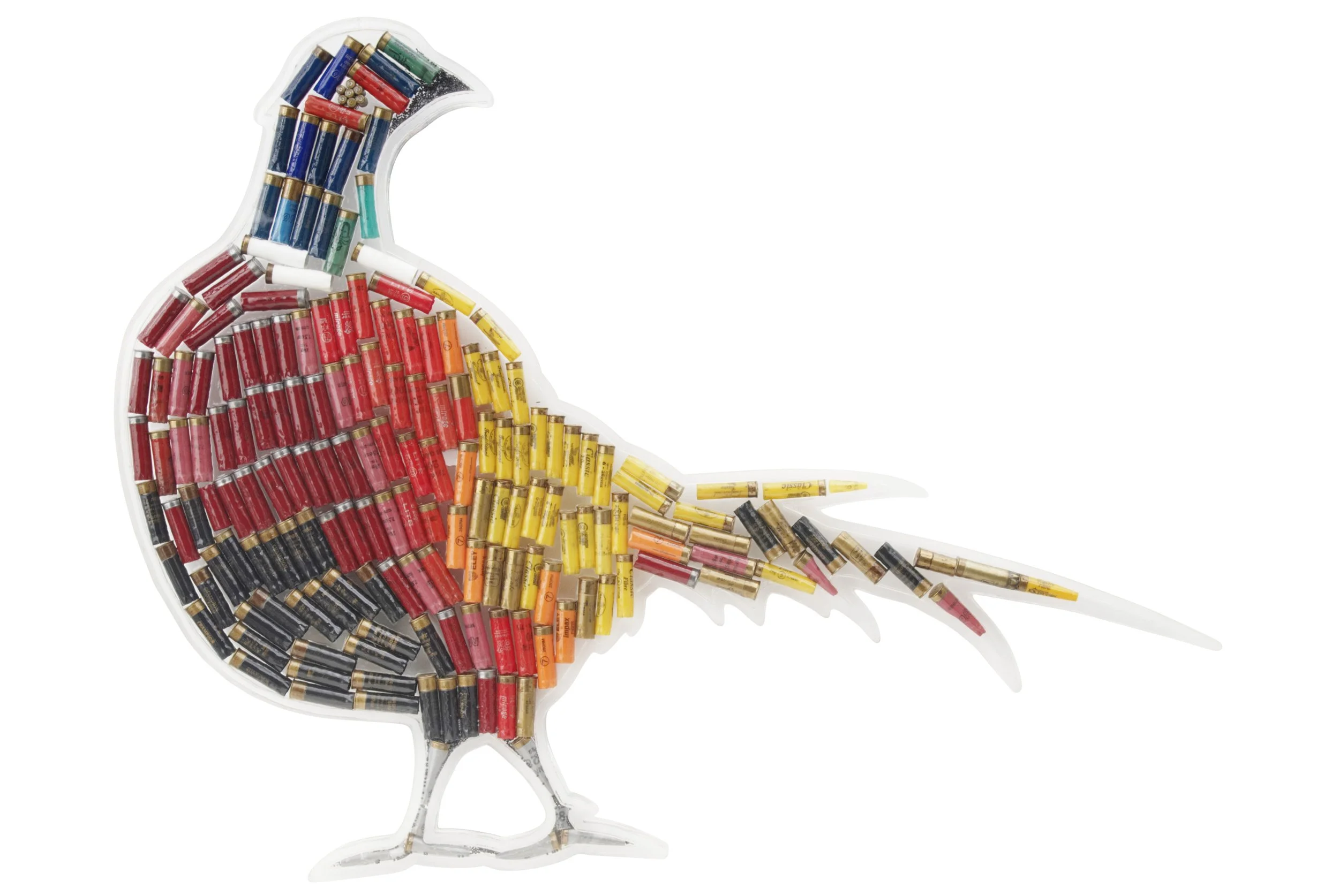Fighting Pheasant (On the Ground) - Empty shotgun cartridges, shotgun pellets and acrylic in resin on perspex. 125 x 67cm. Fighting Pheasant (In the Air) - Empty shotgun cartridges, shotgun pellets and acrylic in resin on perspex. 126 x 73cm.